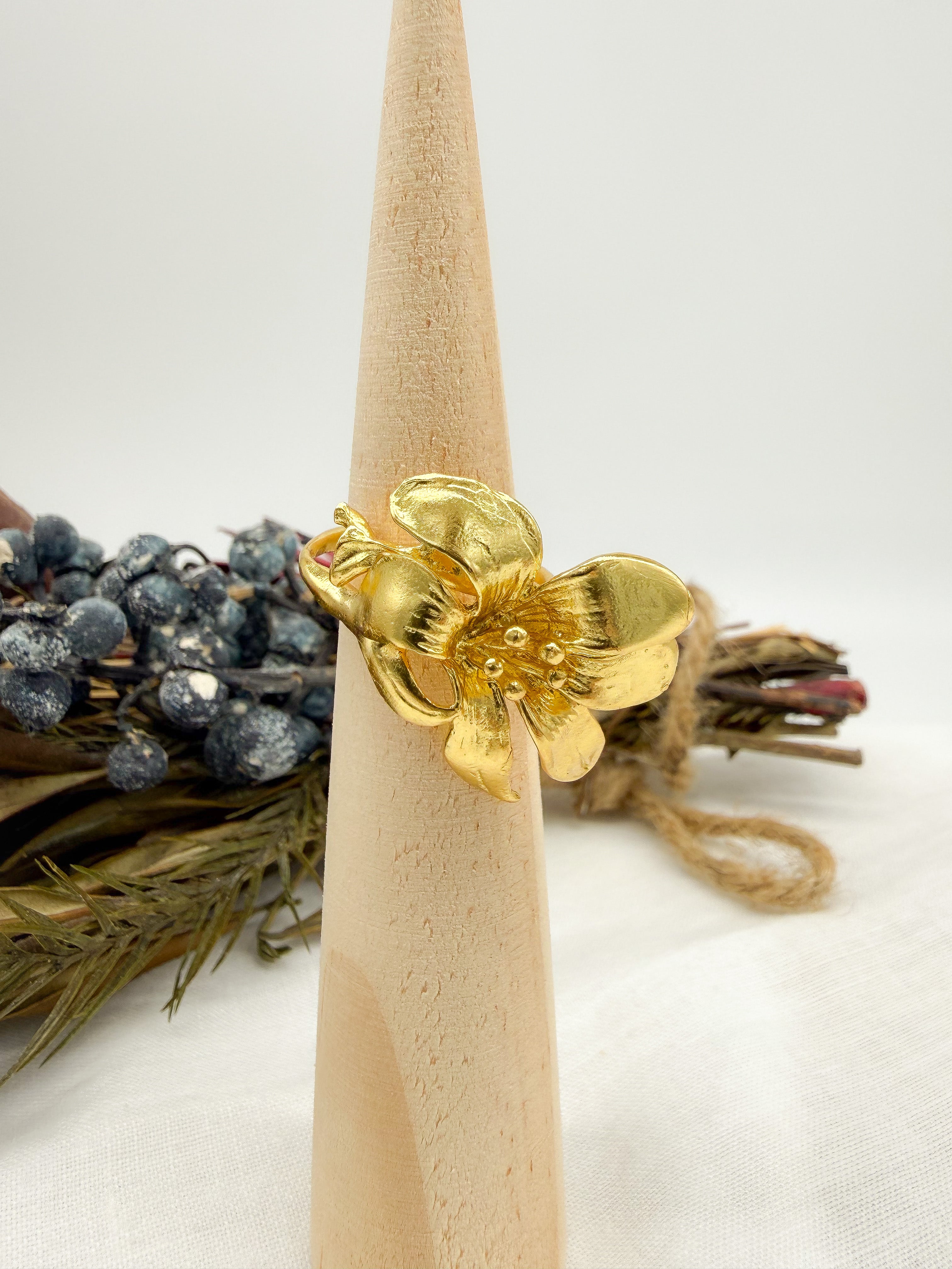 Un anillo dorado de inspiración floral de tamaño ajustable, con una flor protagonista de gran tamaño y acabados en relieve que aportan profundidad y sofisticación. Su diseño llamativo y delicado a la vez lo convierte en una pieza especial, ideal para quienes buscan un complemento con personalidad que destaque por sí solo y eleve cualquier estilismo.