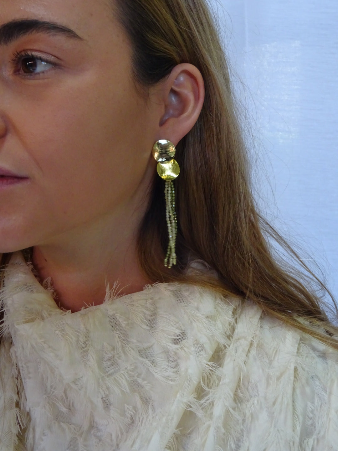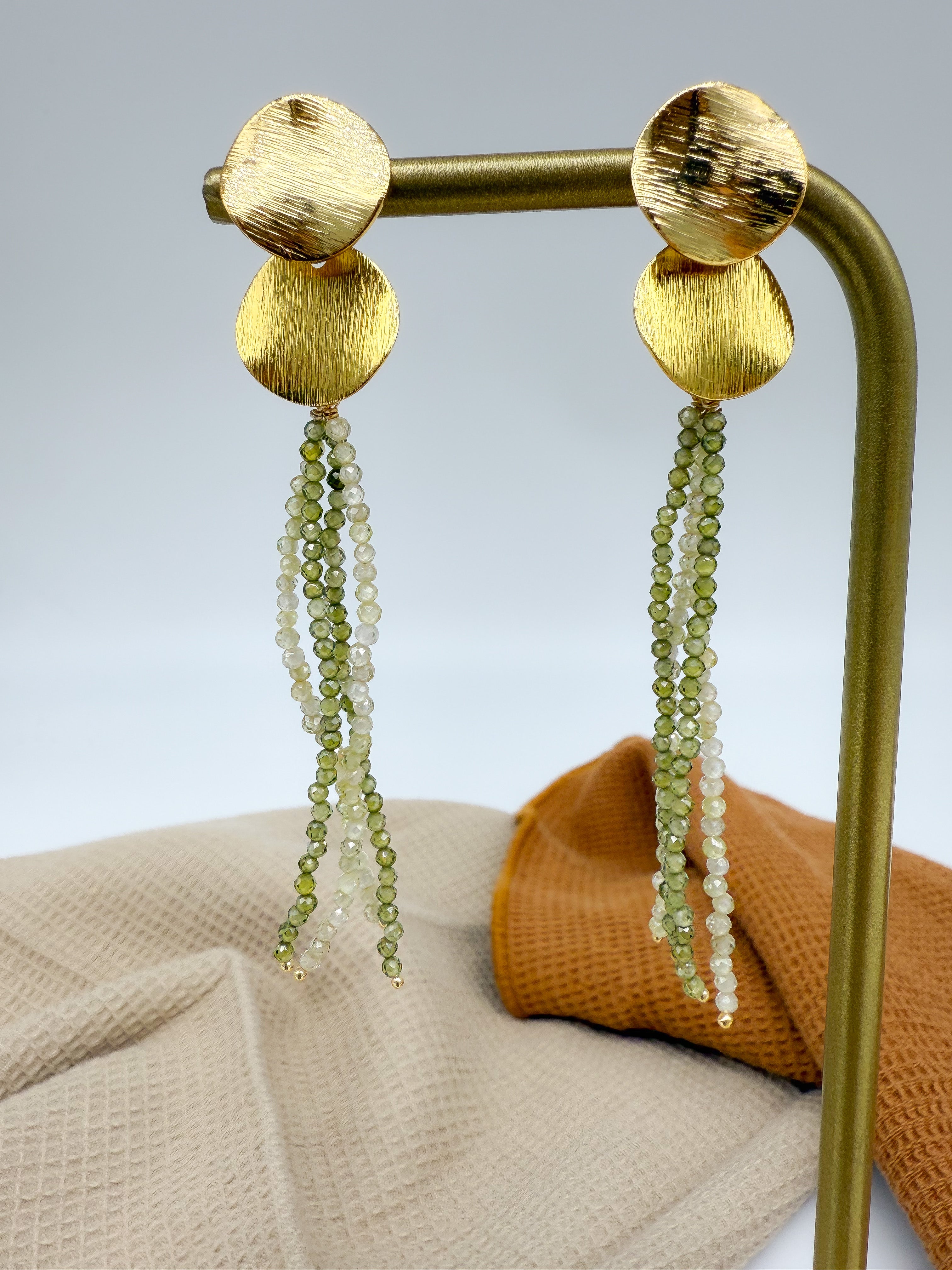 Minimalistas pero con mucha personalidad, combinan piezas doradas mate con hilos de cuentas verdes que alargan y estilizan. Son versátiles: frescos para el día y sofisticados para la noche.