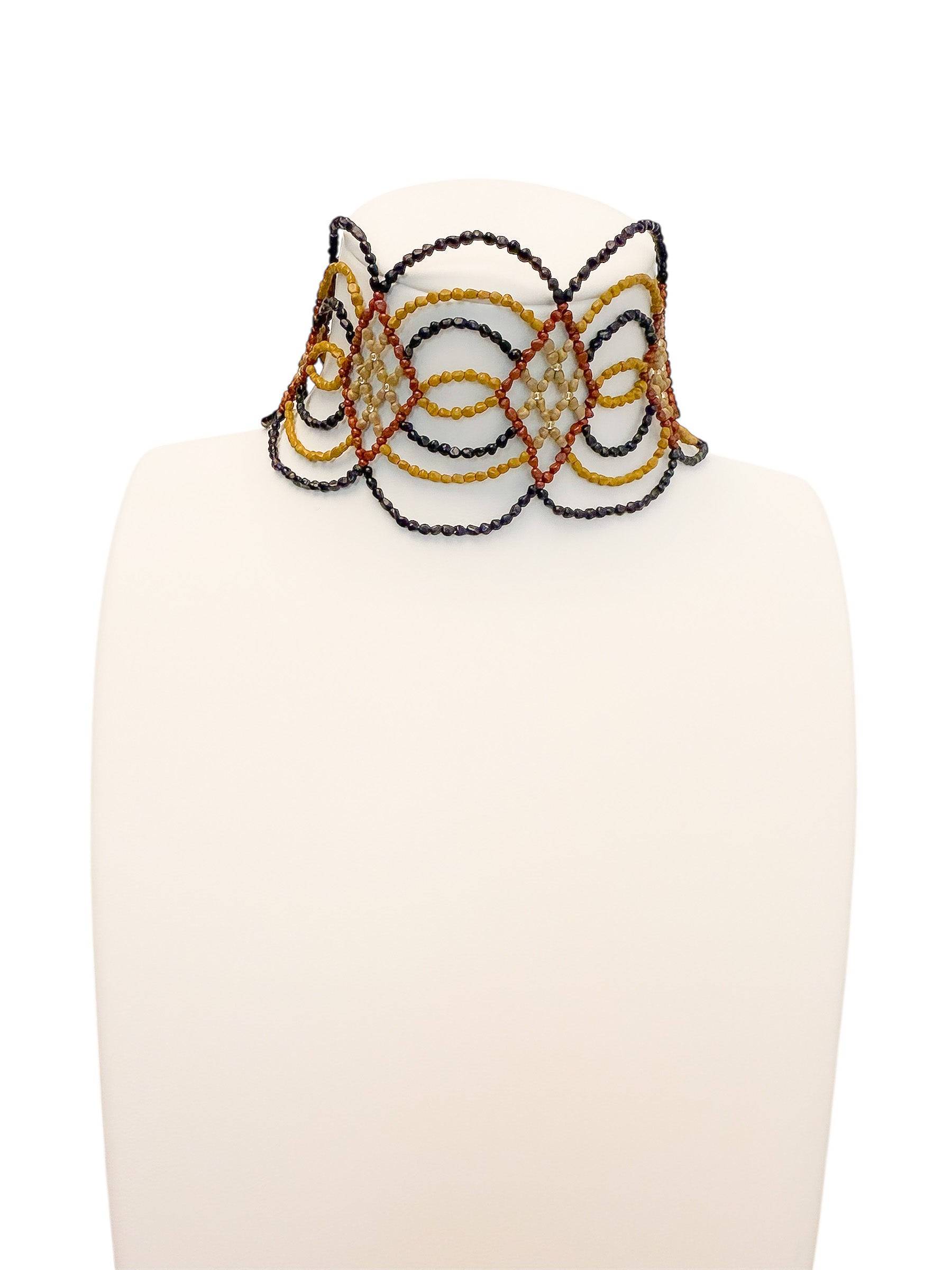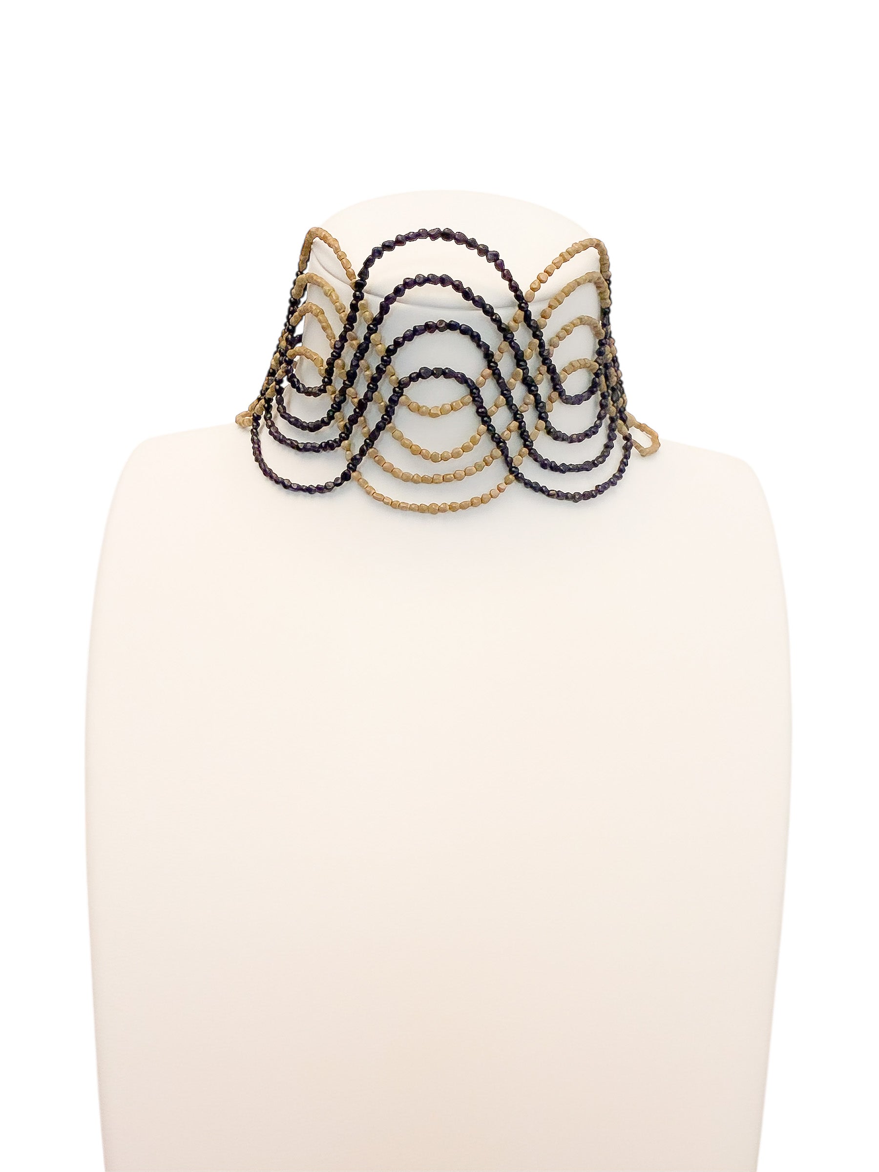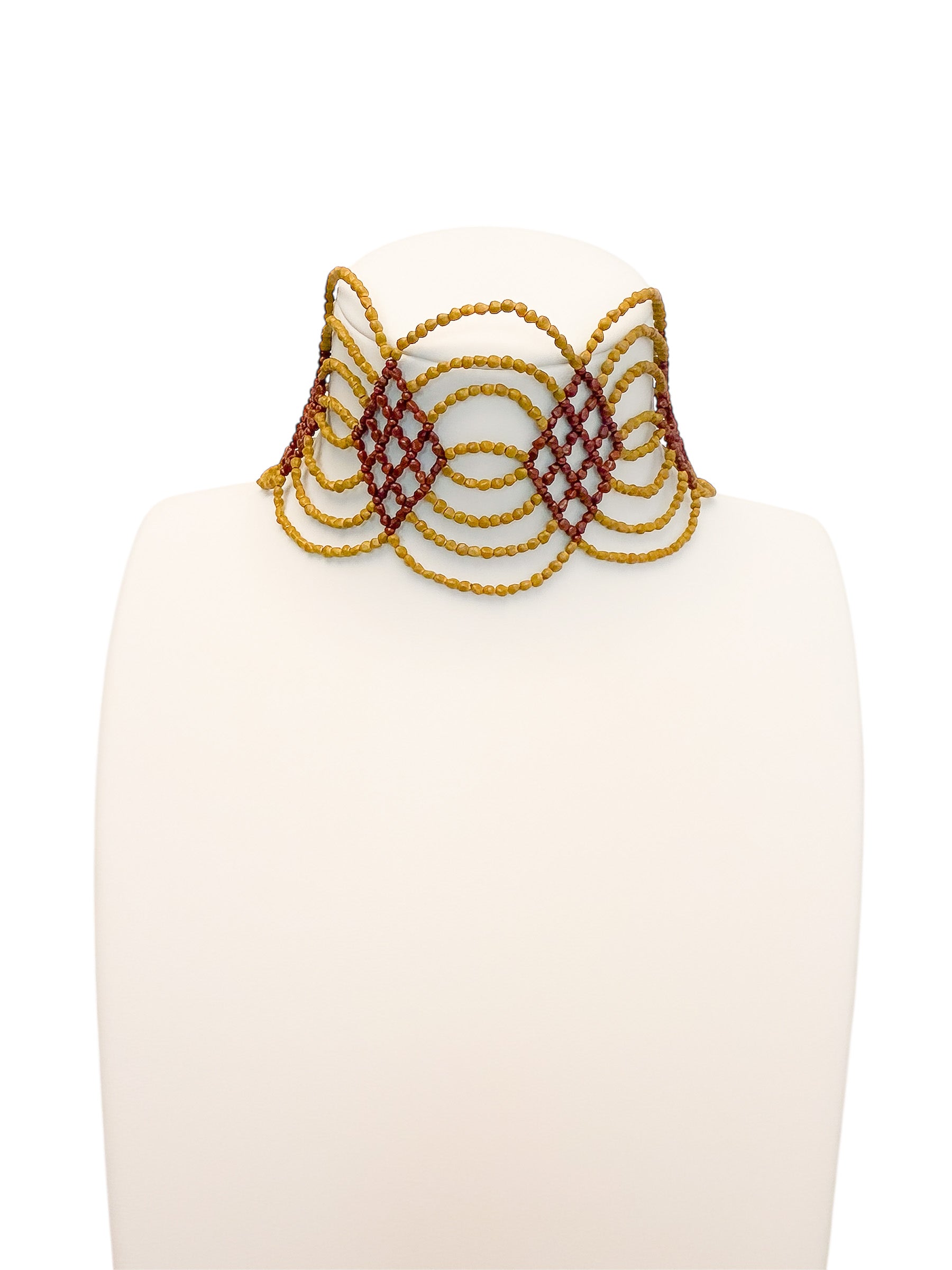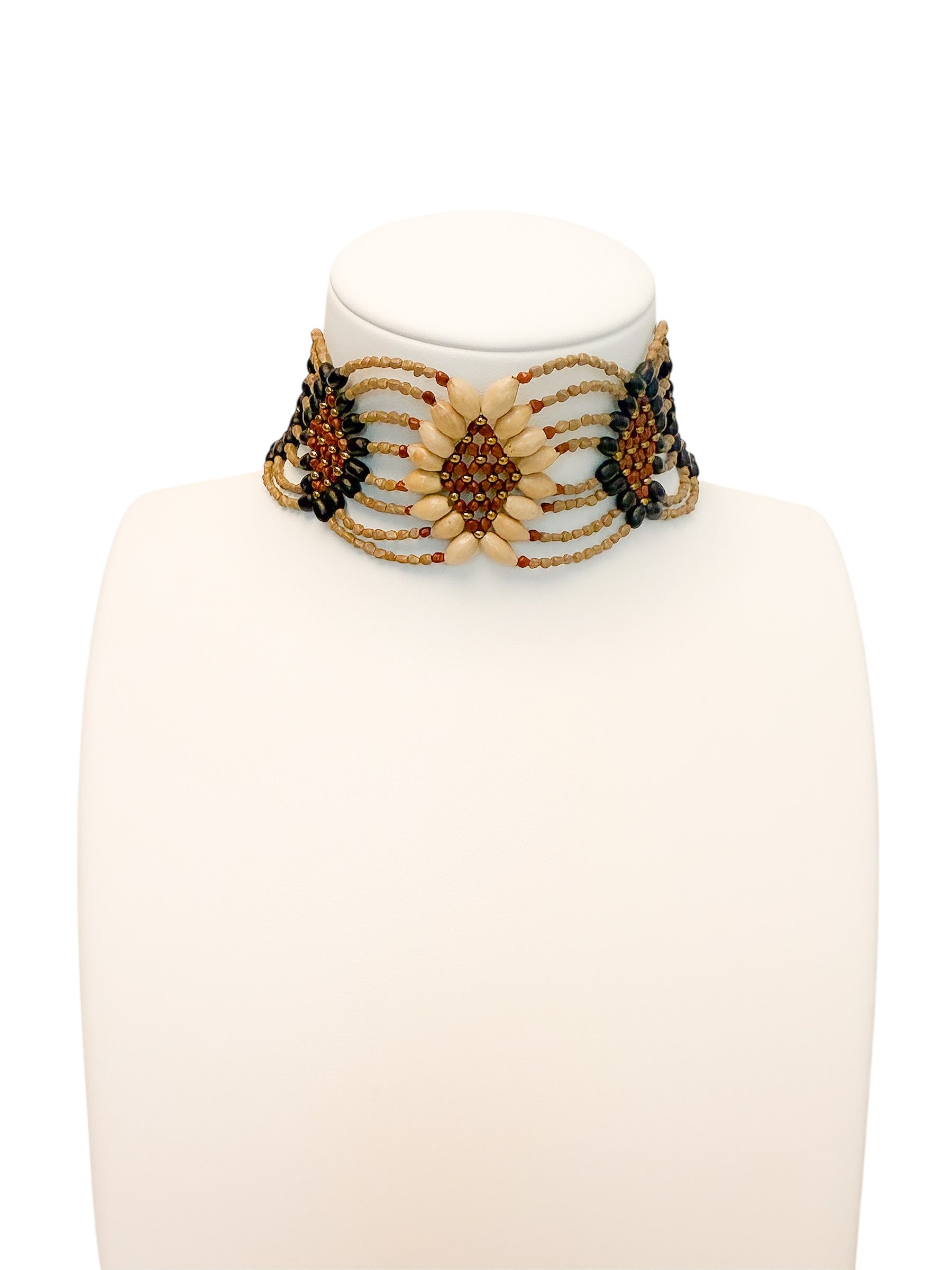 Un chocker artesanal con diseño ondulado, elaborado a partir de semillas naturales trabajadas a mano. Es flexible, por lo que no agobia, y tiene distintos enganches para adaptarse al cuello de cada persona.
