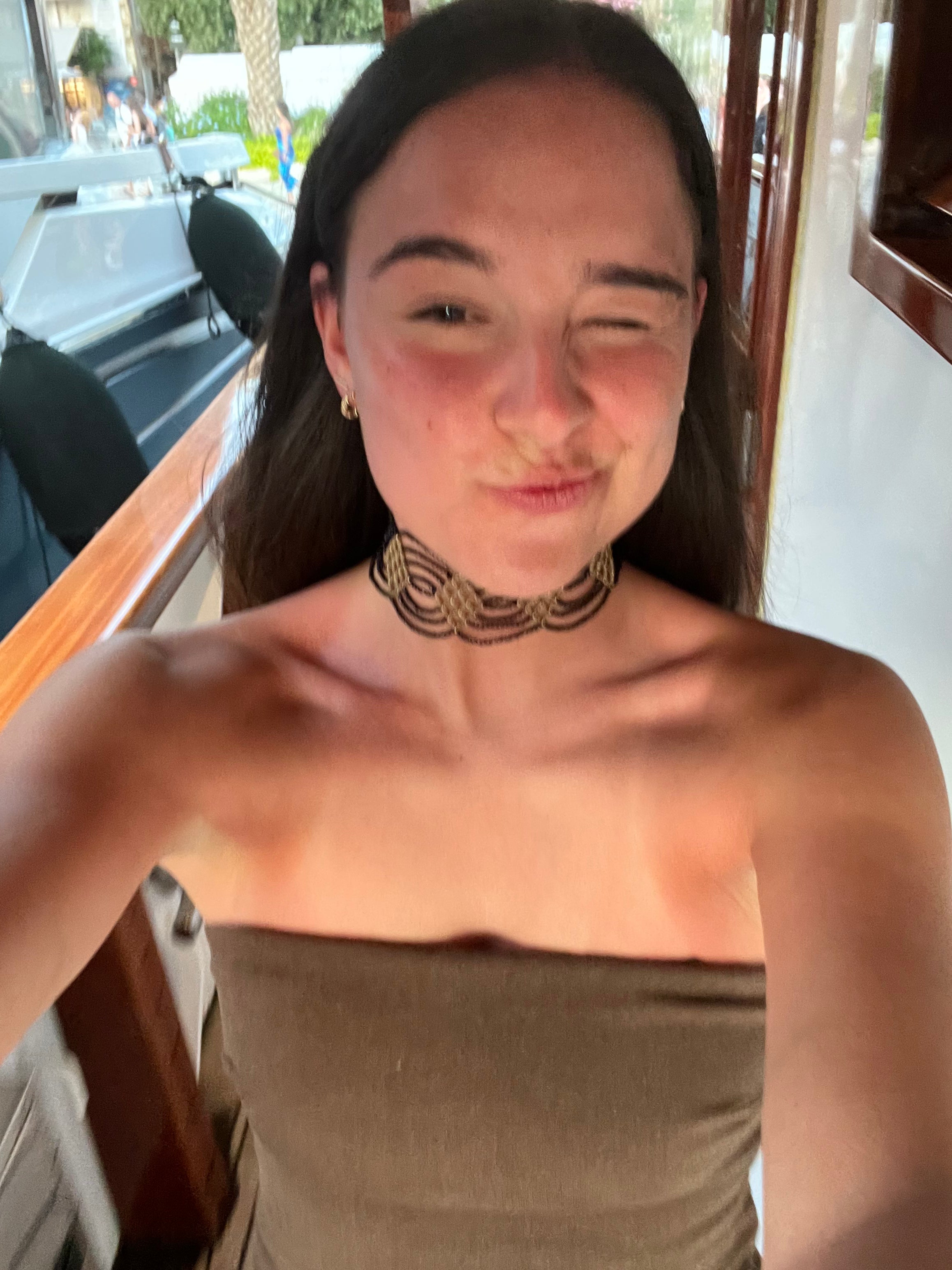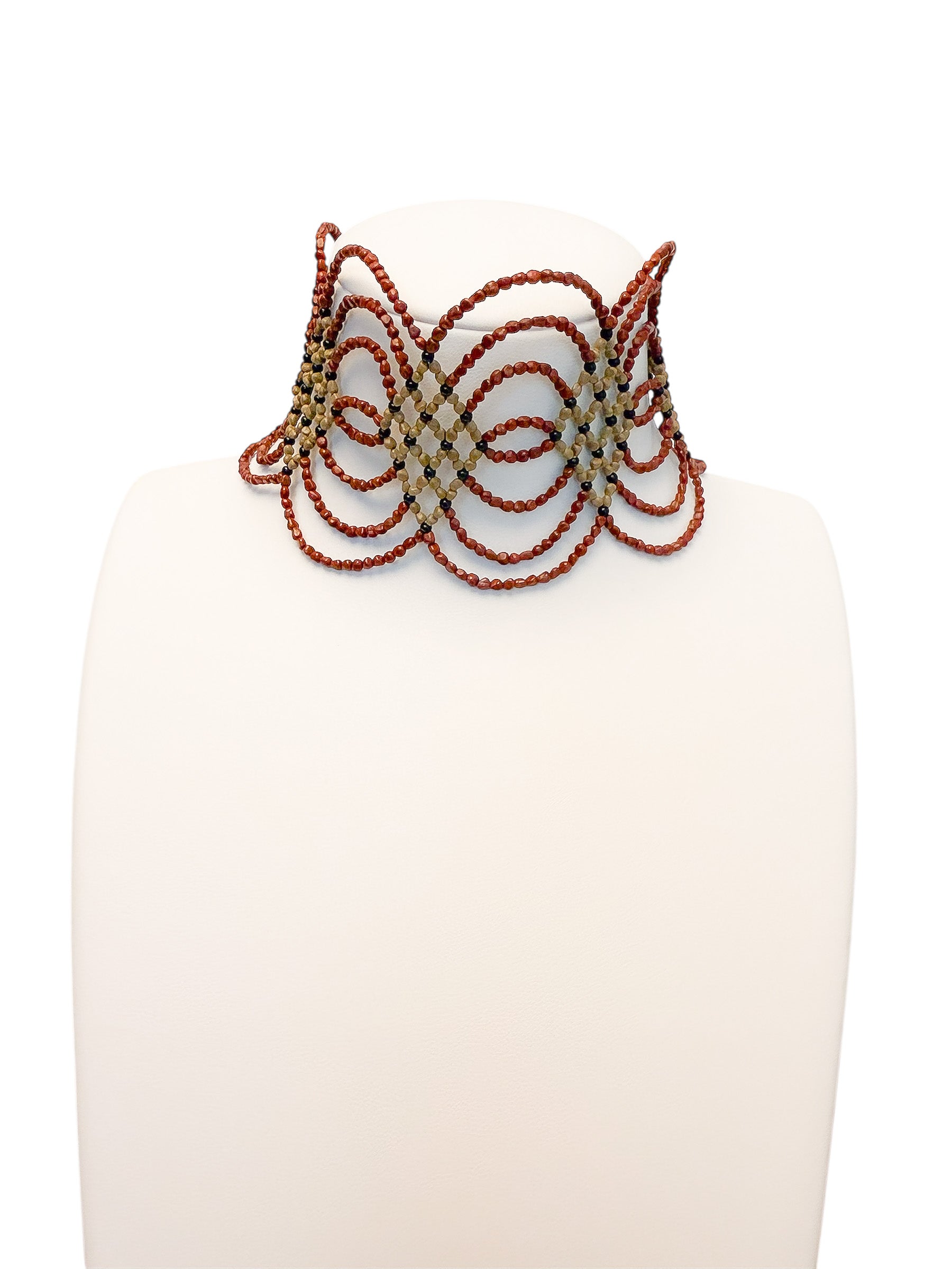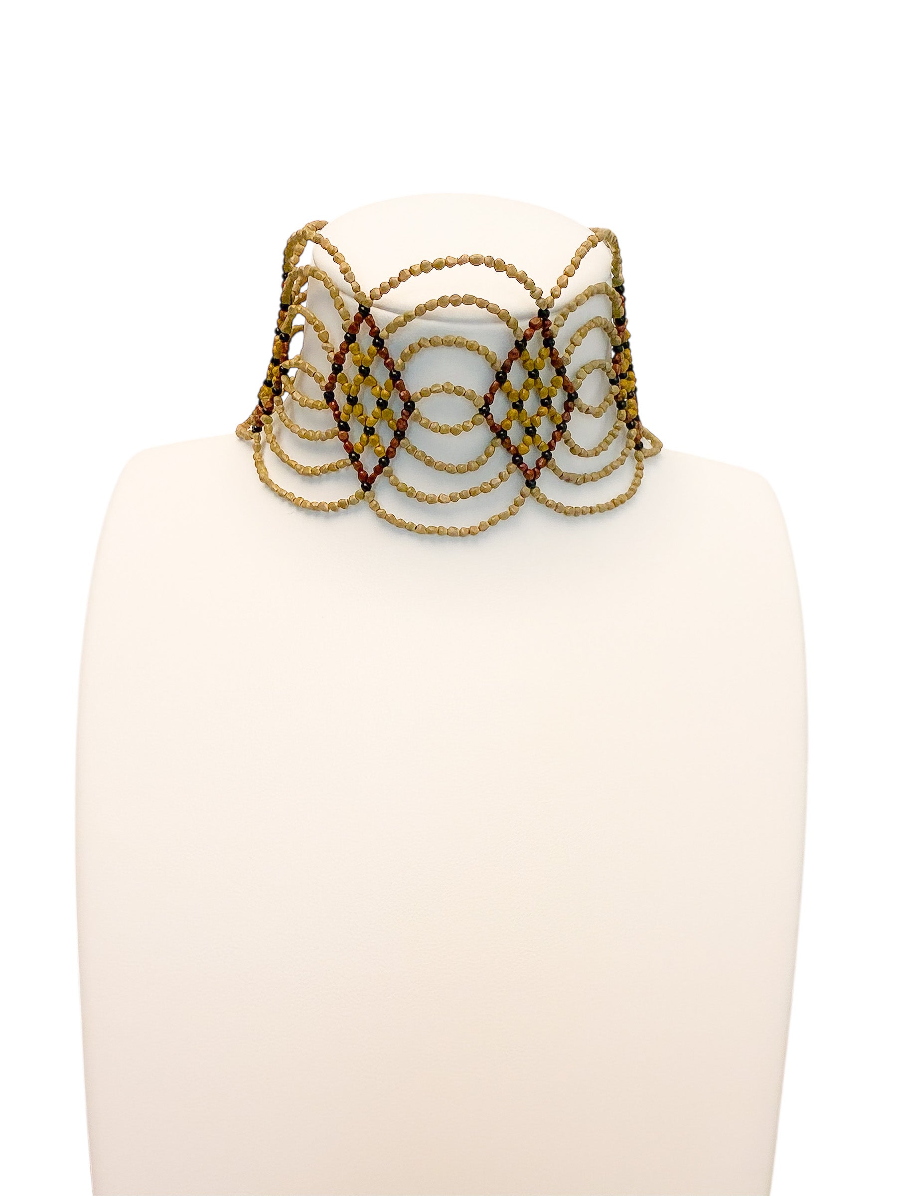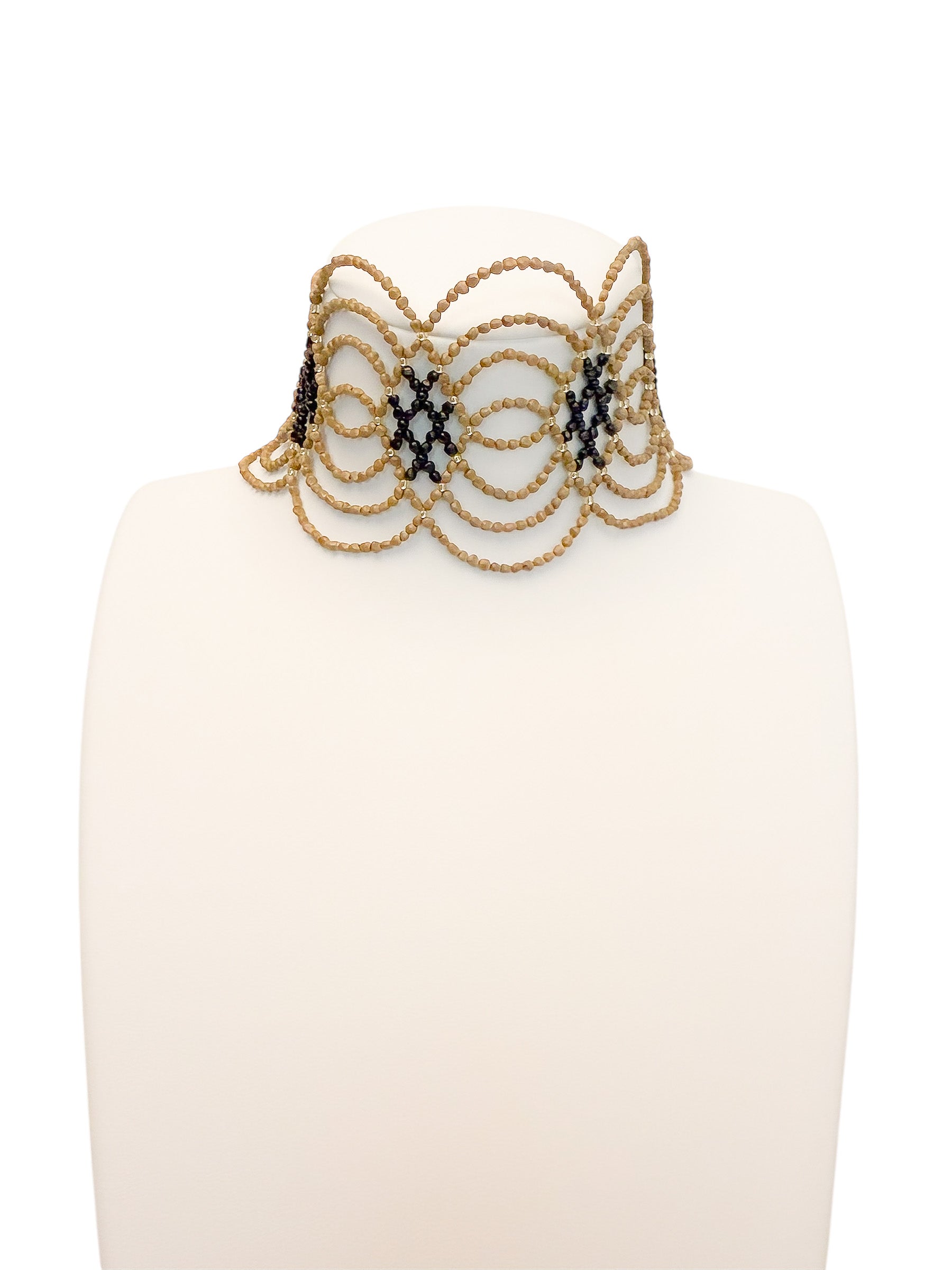 Un chocker artesanal con diseño ondulado, elaborado a partir de semillas naturales trabajadas a mano. Es flexible, por lo que no agobia, y tiene distintos enganches para adaptarse al cuello de cada persona.
